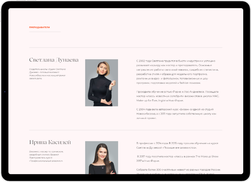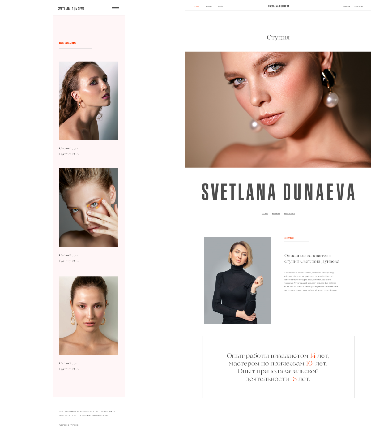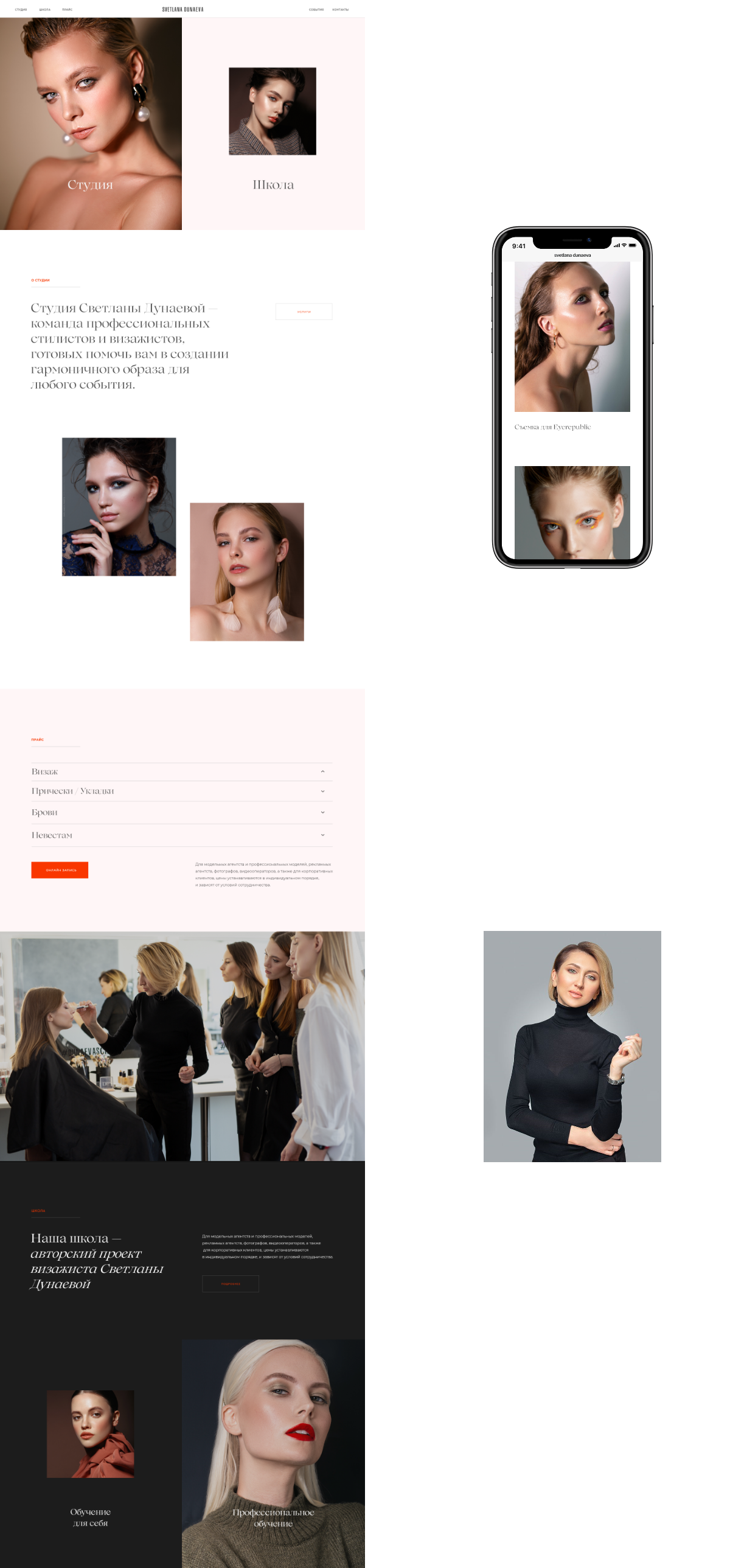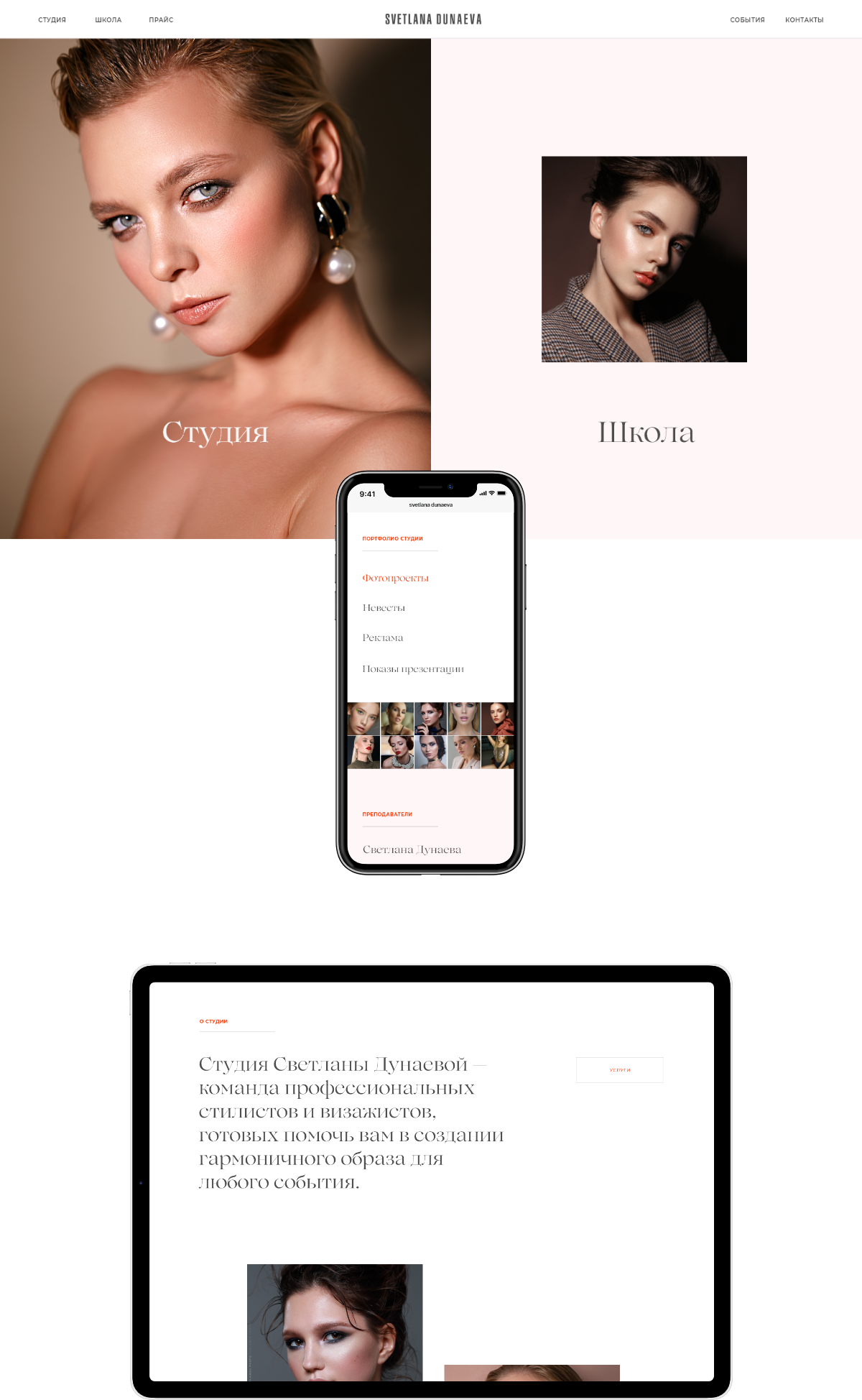 Создал сайт студии и школы Светланы Дунаевой. На сайте анонсируются проекты команды студии, постоянно пополняется портфолио и ведётся онлайн-запись на курсы и услуги стилистов.